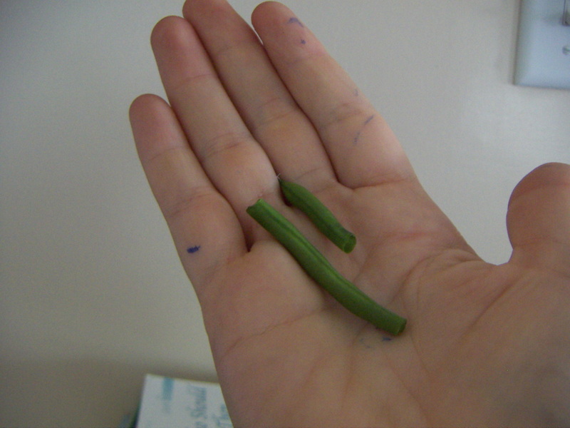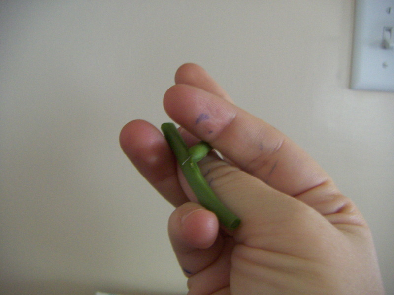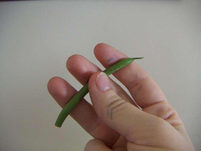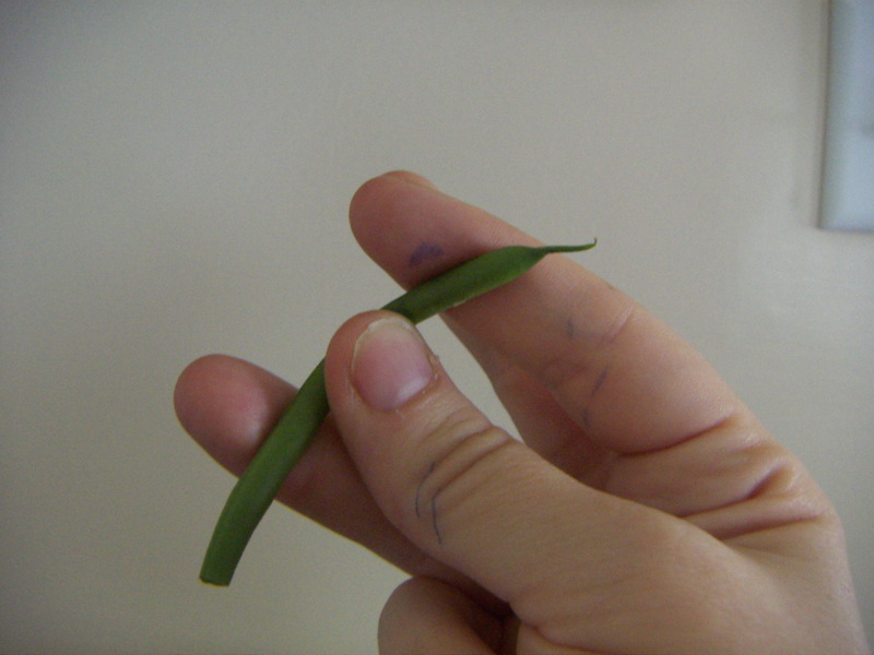Could I go faster if I pinched the stem off with my right hand?  I tried it for a couple of beans and concluded that my first unconscious choice, left-handed stem-pinching, had been the most reproducibly successful one; right-handed, I take off more stem than I usually want.  (Of course, I mused as I turned a bean between my fingers, it’s not appropriate to think of the stem-removal operation as "left-handed" or "right-handed."  One hand steadies the bean, the other hand pinches the stem, and the person that manages the hands distributes the tasks as best as she can.)
