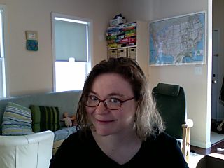 And in the great tradition of suddenly having a brand-new iMac to play with, complete with PhotoBooth, here's me blogging with wet hair in my living room at 7:50 a.m. Sunday morning.
