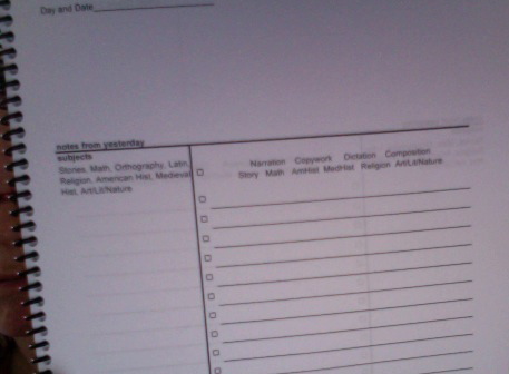 Each record book is for one quarter of the academic year. The front of each book has ten “week pages” for me to write my plan for each week. The left half of the week pages is organized by subject, the right half by day.