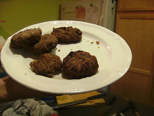 BUT.  Bear in mind that falafel does not normally stand up to being grilled.  It's strictly a skillet-or-broiler food.  These beefalafel patties behaved beautifully on the grill:  stayed together, got attractive little grill marks across them, etc.  So we have indeed learned something new:  If you want to grill your falafel, put some meat in it.