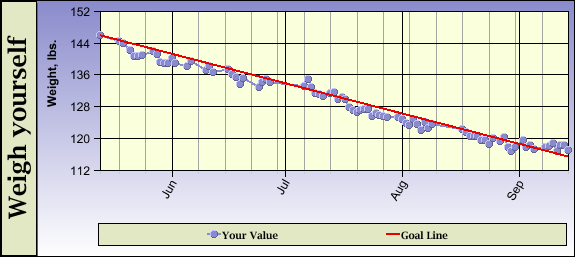 It felt good to cross into "normal" territory a while back. I know my sense of urgency is less. I don't really have to try to drop to the goal (108 pounds — roughly, ten pounds less than the place I've been bouncing around for a week) — but I'd still like to make a grab for it.