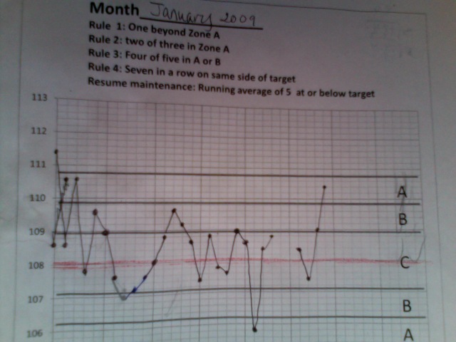 It's like this: I am supposed to begin doing something to bring my weight back to the middle whenever any of the conditions described in the rules are met. I cannot return to normal behavior until the running average of five measurements in a row crosses the midline again.