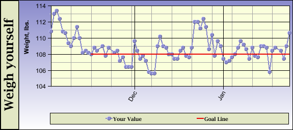 While I was losing, I knew that to succeed I would have to plan very carefully, to try new things slowly and to pay attention to how my body responded, so that I could find out what would work and what would not. Truly, I know that my maintenance will be more successful if I continue that careful planning and charting, trying new things slowly and paying attention to how my body responds; but I've really slacked off on the careful experimentation. I have been reactive rather than proactive. I guess it's been kind of exhiliarating to eat toast for breakfast pretty much whenever I feel like it. I'm kind of giddy. It's the honeymoon phase, I suppose. Sooner or later I do plan to start systematically adjusting my diet, to try to bring it under tighter control all the time, rather than letting the weight spike up and then controlling closely for a few days until it comes back within limits. (Notice the spike right at Christmas!)