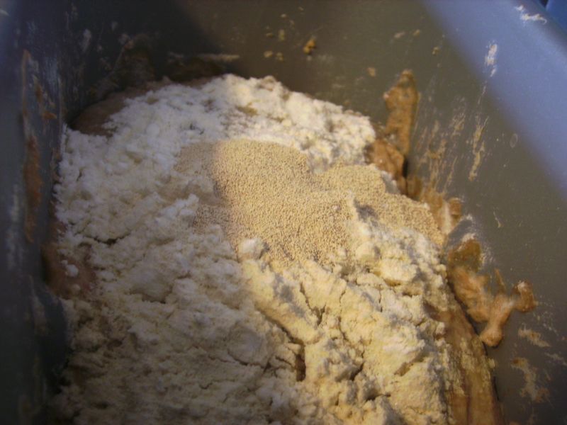 4. I dug a little well in the dry ingredients and added the yeast to that.