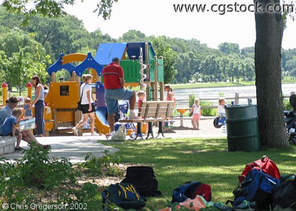 I met Mark after work in the West 36th Street parking lot.  We pulled the jogging stroller/bike trailer out of the car and threw his bike in the car.  M.J. got in the stroller, the boys jumped excitedly (Get OUT of the bike path!  Onto the grass!  I said get OUT of the bike path before you get run over!  Oscar, tell your brother to stay off the bike path!), Mark set his watch and ran off, and I set out walking with the children. The boys were instructed to race to the next park bench, turn around, and come back — my favorite method for getting them good and tired.  When we got within striking distance of the 32nd Street playground, I let ’em go.