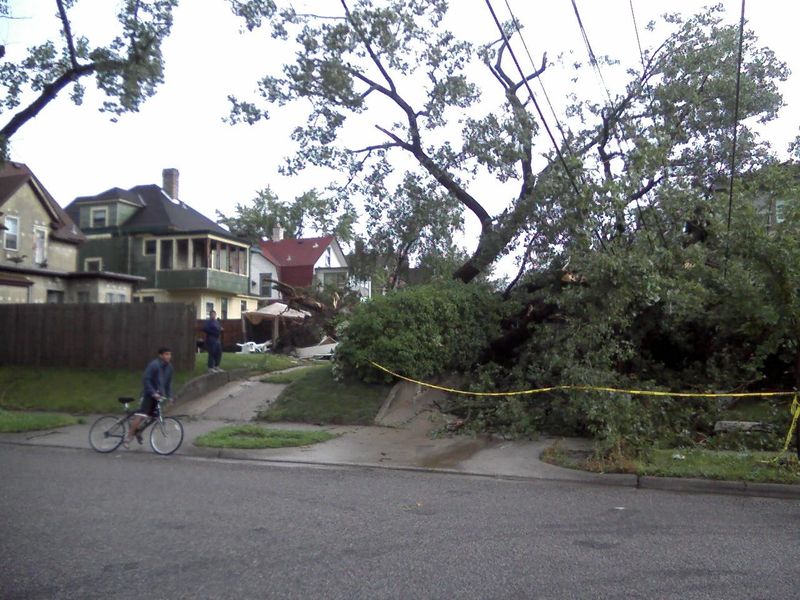 Power was back on, it seems, by 11 p.m., with new poles running lines down the alley (although the tree and the crushed garage are still blocking the end of the alley).  I must say, the city crews and Xcel Energy did a damn fine job restoring power quickly.  In the ten years I have lived here, Minneapolis has impressed me with its response to severe weather in general.