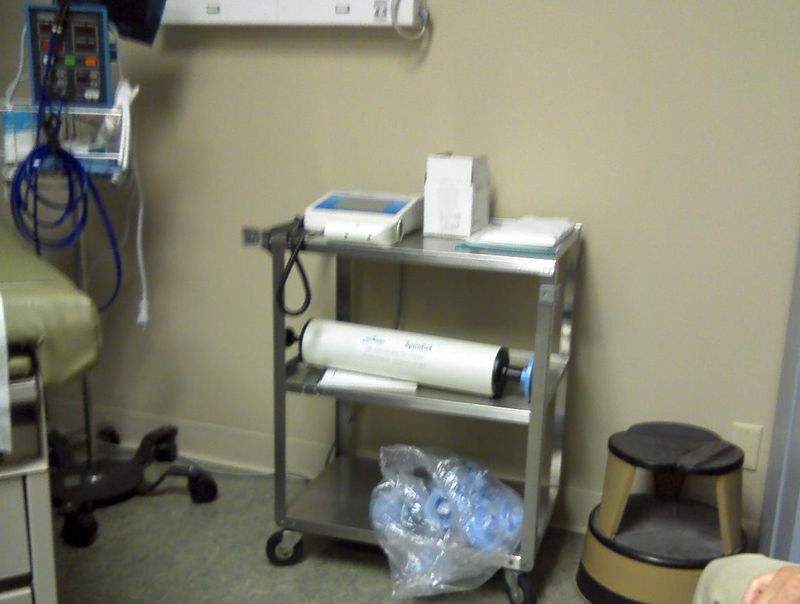 On seeing the "3.00 Liter Calibration Syringe" on the middle shelf of the cart in the pediatrician's office: