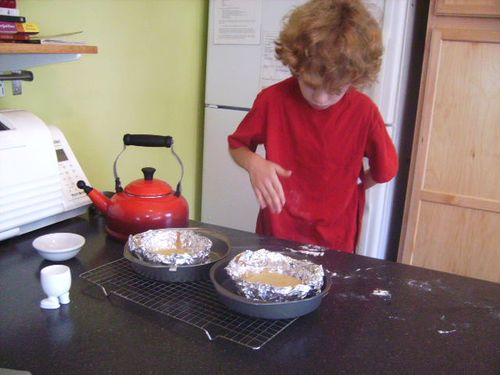 The worksheet we developed for making sure that each small cake contains the same amount of egg. (This was really, really fun for me to lead him through on Monday when we prepared for the lab). Complete with hands-on lesson in Why We Must Align Digits Neatly In Our Lab Notebook Lest We Make Simple Addition Mistakes. Woo-hoo!