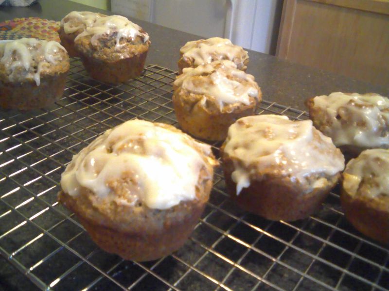 These are sort of halfway between a cupcake and a muffin in sweetness, but with enough good-for-you stuff that they totally qualify for breakfast.  The glaze is optional.  I think raisins would also be a nice addition.  They are a little more work than regular muffins because of the creaming-the-butter step; if you keep your stand mixer on the counter, you could use it and speed the process up; but if it's trouble to get your mixer out, as it is for me, you can totally do this with forks and whisks and such.