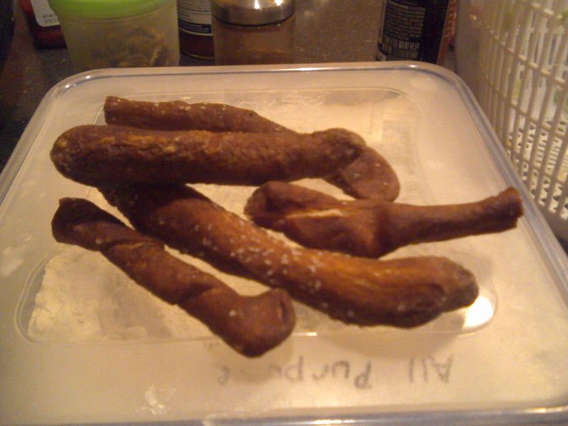 Kinda funny looking, aren't they? Well, this picture was taken several days after I made the pretzels. Meaning that the best ones have already been eaten and only the runts are left.
