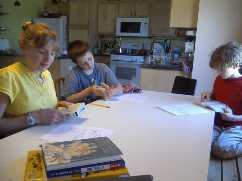I was working with the three oldest children on Latin; they are doing a worksheet I wrote up to introduce them to the Latin-English dictionary. (In the foreground you can see the books we worked from for U. S. History earlier. In the background: my kitchen.)