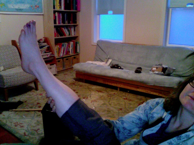 Yesterday morning my middle toe found a step stool in the kitchen.  Right up against the wall so it didn't give a millimeter.  Here, let me pause in my R.I.C.E. therapy to show a little leg, courtesy of Photo Booth: