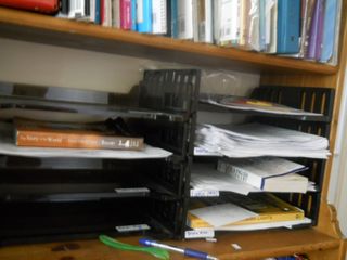 Things I don't have time to put away carefully, but that I will need pretty soon, and won't want to spend time searching for: schoolwork sheets that I'm preparing and assembling for upcoming lessons; schoolwork that's partly done and needs to be worked on again; finished work I need to go over again with the children; library books.
