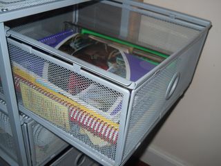Lots of homeschool items must be kept safe. The law requires me to keep copies of certain forms; I want to preserve a "portfolio" of each child's selected artwork and writings; I must keep and add to the current year's school records, aka "grades"; I already printed up some worksheets and I want to assign them in a few days. I also have to promptly put up certain dangerous tools like the hot glue gun and the craft knife. But only sometimes do I have the leisure to carefully store files and tools away in an organized system. And only some of these things need to be kept close at hand.
