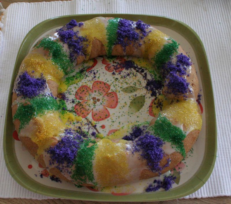 Down here in New Orleans, Epiphany heralds not so much the end of the Christmas season as the beginning of the Mardi Gras season. The famous parades don't really happen until a couple of weeks before Mardi Gras itself–but the balls and banquets begin on "Twelfth Night". An important (hee) part of this whole Mardi-Gras-season is, of course, King Cake. Every local bakery makes them–you can get them at coffee shops, grocery stores–just about anywhere, in this town, at this time of year.