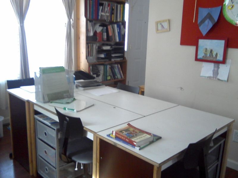 See the desk with the dry erase board and marker on it? I can stand or sit there. Now my five-year-old can sit directly across from me, and my eight-year-old can sit at the desk on the right. The eleven-year-old still has access to his desk on the left, although he has proven himself focused enough to be allowed to work anywhere in the house that suits him.