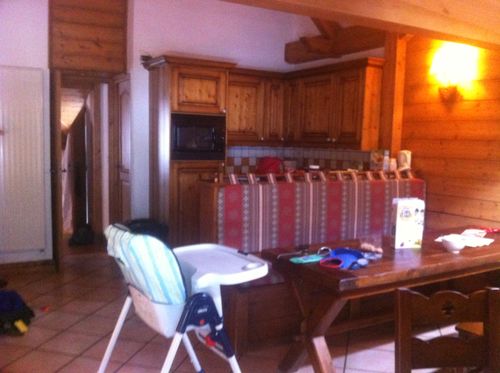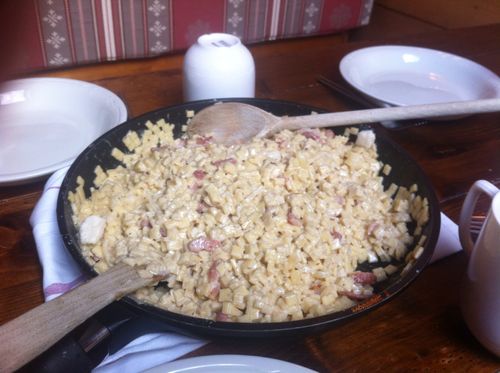 It being Sunday, the big stores were all closed, but I found a little grocery that was open, sort of a convenience store. I needed to keep it simple: I had in mind to try to buy chicken, noodles, carrots, and onions for a soup, and also to buy bacon, tomatoes, and onions for pasta sauce. I found almost all of that: two cold, packaged, roasted chicken leg quarters which I thought would make a broth, a fresh chicken breast, carrots and onions; packaged bacon cut into lardons; a local pasta shape called crozets, little squares about 7mm on a side; cream. Also milk and bread, frozen haricots verts, and some grated parmesan. I came home and with the help of my Haute-Savoie cookbook I made crozets with lardons and cream and onions.