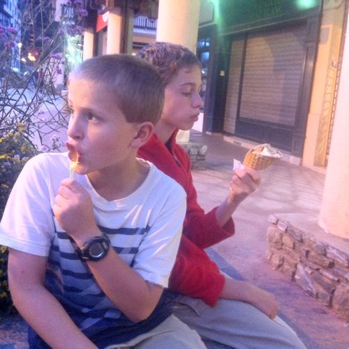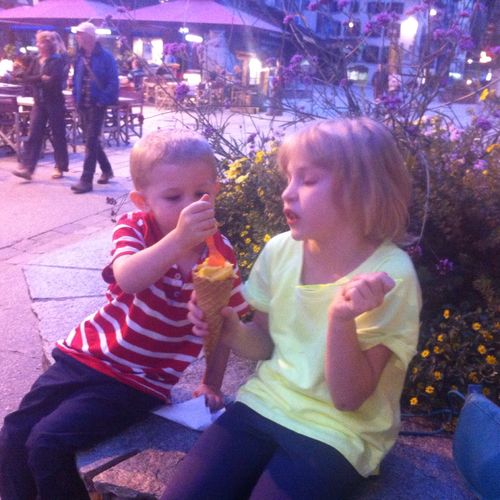 After that, most of the day was the business of feeding and clothing ourselves. For lunch we ate some pasta in our teeny kitchen — rotini with sinoke tomato sauce and some fresh ravioli with asparagus filling, which I boiled and then sautéed in butter with minced ham. The big boys and Mark planned to go out on the glacier with a guide the next morning, but much of the boys’ gear had been in the lost suitcase. Air France gave us an allowance so they went out to replace items. Then after they returned, having found some kind of clearance store that stocked most of what they needed, I went out with a couple of nylon shopping bags in search of food for dinner.