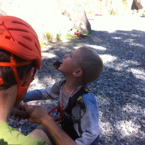 I carried the baby around and entertained the four-year-old between his turns. I was more interested in watching and listening to the French climbing instructor charged with about a dozen children from ages seven to twelve. Mark noted, “It’s a good thing she’s using a Grigri to belay those kids, since it leaves one hand free for her lit cigarette.” She also used the cigarette hand to gesture as she called up to the approximatelt eight-year-old girl which way to look for the bolts. The eight-year-old clambered all the way up, setting quickdraws as she went, then ran the rope through at the top and came back down, cleaning the quickdraws. Mark said to me, “Hey Erin, can you ask the instructor to ask the girl if she can bring down the carabiner I left up there?” He had abandoned one when he soloed up to look for a new attachment point, decided he didn’t want to go any farther, and rappelled down.