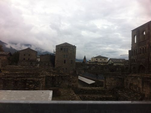 You can get completely different weather on the opposite side of the mountains, but it was just as drizzly and gray when we emerged in Italy. It’s about an hour to Aosta altogether. Even with the drizzle it’s a lovely drive with the mountains rising up all around you, many of them terraced and quite built up.