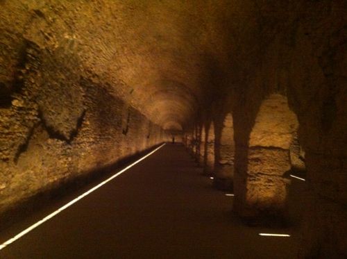 The 14yo had found a brochure that explained the structure and gave a map of the original layout showing the extant parts in red. The cryptoporticus was around the Forum of Augusta Praetoria. French Wikipedia tells me it originally formed a rectangle, 89 meters long by 73 meters wide, and that two temples were situated atop the area it surrounded.