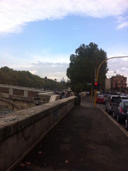 After a while of walking along the Tiber, lined with smooth-trunked, broad-leaved trees, we caught our first glimpse of the great dome of St. Peter’s: