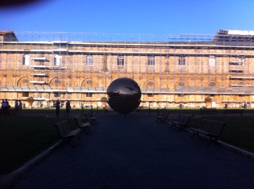 Inside our first stop was in a lovely courtyard, the Cortile della Pigna, with a great brass sphere in the center. “Can I run?” asked the 4yo, and took off before Luisa could say anything.