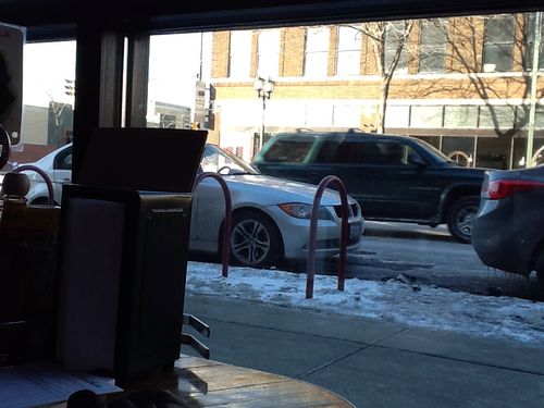 I do not know why. Seriously. I cannot put my finger on anything particularly special about this restaurant. Nothing wrong with it either. But I want to be here. Sitting at one of the tables by the big windows. Looking out them, at the fairly nondescript view: the parking meters, the bicycle racks, the pizza restaurant across the street, the payday-loan place on the opposite corner. The people hurrying past, extra fast today to coax a little warmth from inside themselves to fight the frigid weather.