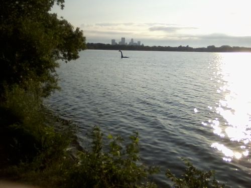 It is a statue or something of a lake monster. I have seen it before, but not here. The last time I remember seeing it, it was in Lake Nokomis, visible from Cedar Avenue where it crosses the water. I think there must be someone in the city parks department whose job it is to move this enormous figurine around from lake to lake so that each year it is found in a different place.