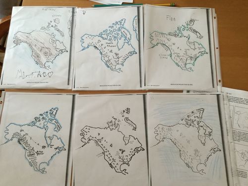 They saved time by using a worksheet with the southern part of the continent already outlined, since what they need to see is the difference that the projection makes in the northern part. In the above picture, the top left drawing was done by a fourth-grader, the bottom right by a seventh-grader, and the others are of kids whose ages fall between that.