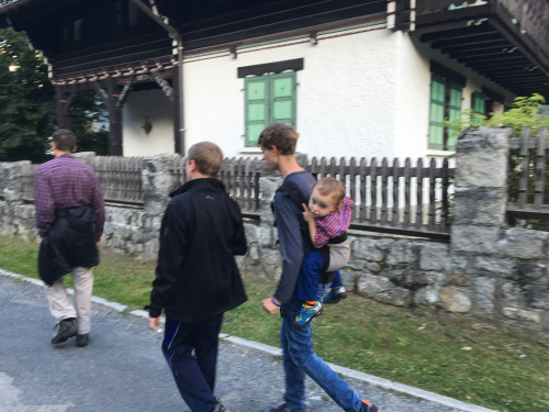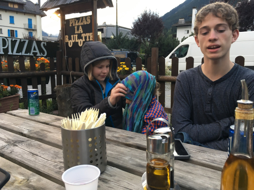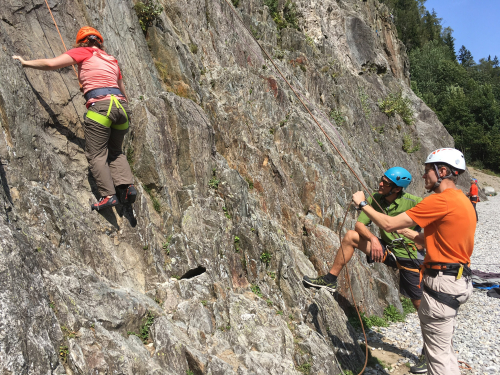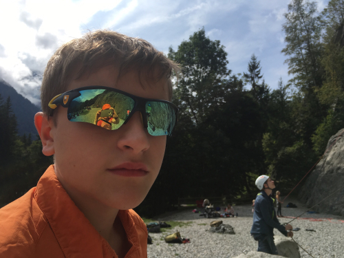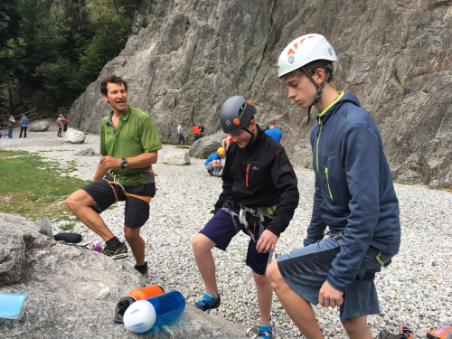 Jeff (green shirt) is an American who splits his time between Colorado and Europe. He couldn’t believe it had been three years since our last trip. I think he’s great with our kids, and Mark has been out with him several times. Nothing we will do here at this crag will be very technically difficult, so we don’t really need a mountain guide for this; but we do need another adult who can belay, since somebody has to be watching our younger boys all the time, and Jeff needs to get an idea of how well our older boys can take instruction since they’re going out with him on the mountain the next day. So he spent some time taking them through a few drills which he suggested they could practice at home.