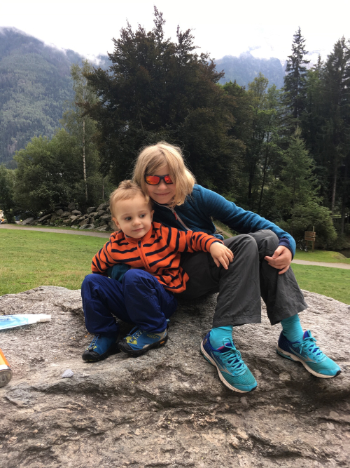 The wall had a long smooth section with very few toeholds, good for technical practice; but practically had stairsteps on either side. I really can’t overstate how marvelous the rock is. It is very rugged and steppy, easy to find footholds and handholds almost anywhere you look, with ledges here and there on which grow spiky grasses and tiny tufts of mountain flowers. The rock glitters with mica in places and in other places so iron-red and smooth you wonder if it would attract a magnet. And yet there are smooth sections where you must “step on nothing and trust it will hold you,” as Jeff put it. There are bolts fixed in places to practice lead climbing; in the afternoon, my oldest would get some practice and instruction with those, after I went home with the other four kids for a rest, to let Mark and the 17yo profit from the afternoon with the guide.