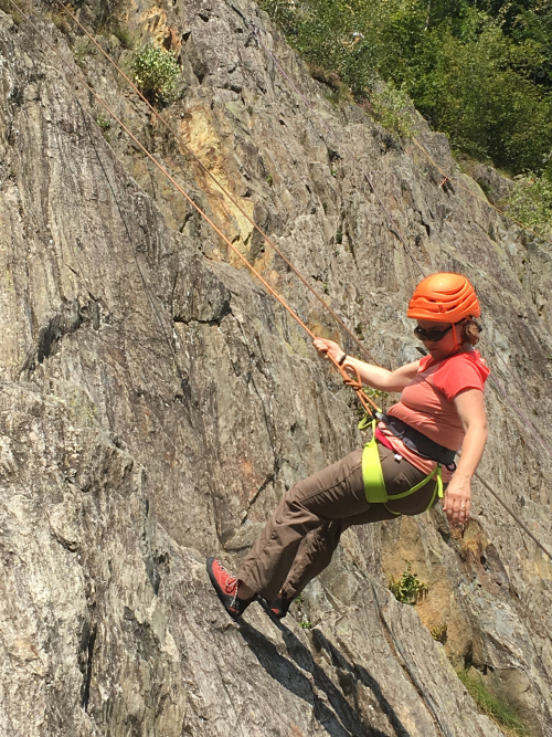 After the 7yo came down, Mark belayed me for a quick and easy warmup climb; and then when it was my turn to be lowered, which entails leaning back into the rope and “walking” backwards down the rock, I was surprised to find that it was kind of scary. Surprised only because I have spent enough time in the climbing gym on auto-belay to not find that scary; but it turned out the comfort didn’t transfer very well. I got used to it, though, and found my feet.