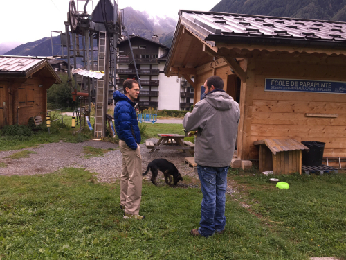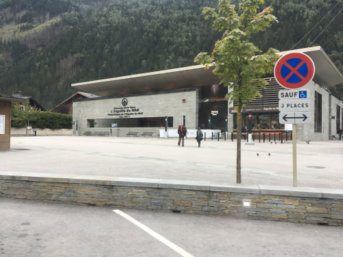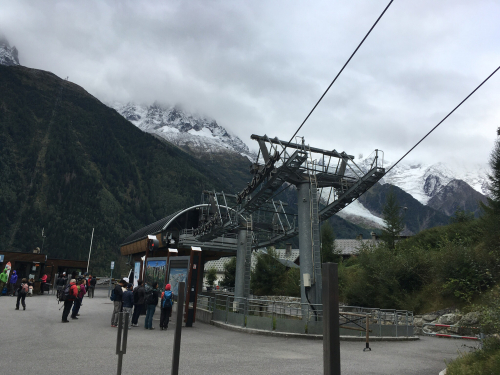 But when Sandie showed up, she told us that the wind was coming from the wrong direction to fly from Brévent, and we would have to send her off from the Midi instead. So we all hopped into the van from her parapente company and drove across town to the other lift. Sandie arranged for the money we’d paid for the other lift to be applied to this one. And we sent our daughter with her, walking across the plaza.
