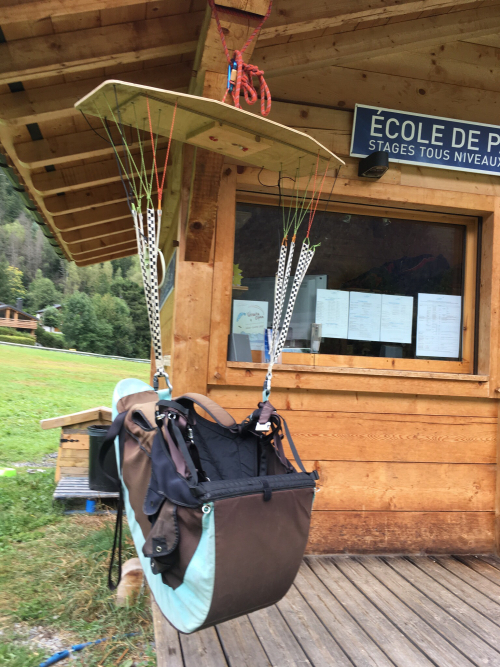 The van took Mark and me to the landing field where we had a chance to examine a mock-up of the parapenting harness, hanging there for the parapente school.