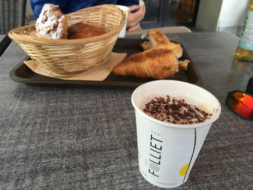 Mark had a petit pain au chocolat and an almond-paste-filled, sugar-dusted confection. I had a perfect plain croissant, and a cappuccino.