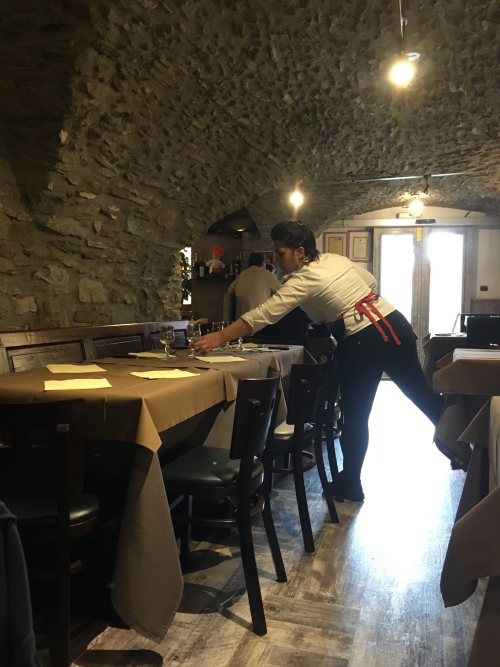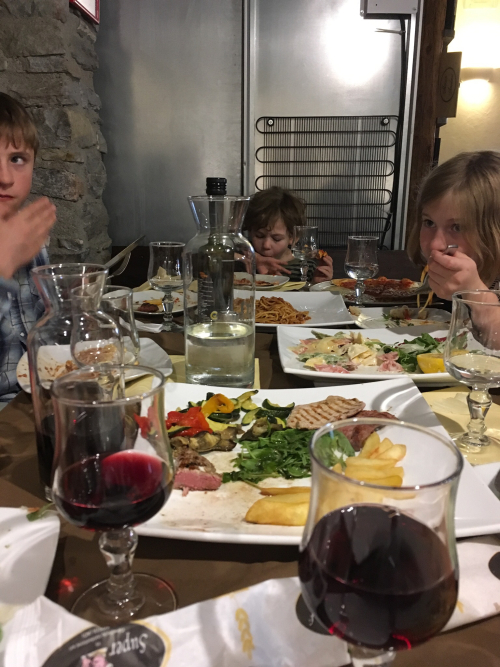 We chose a little town called Morgex, and our oldest and I each mapped out a restaurant. The one I chose turned out to be all boarded up despite the posted hours on the outside. So we got back in the car and drove to the one our son chose, and that one was cheerful and open, and had a table ready for seven.