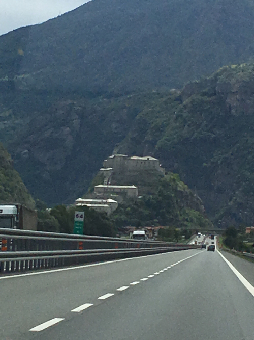 We drove past Aosta, past all the castles in its little valley. Here is the very impressive Fort Bard, which commands the top of a hill-within-a-valley. We might take a tour of it on the way back, if we don’t decide to go to Turin instead.