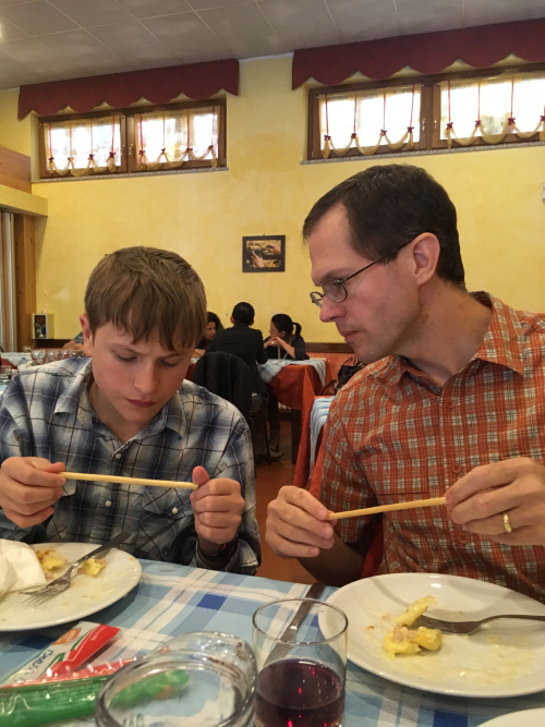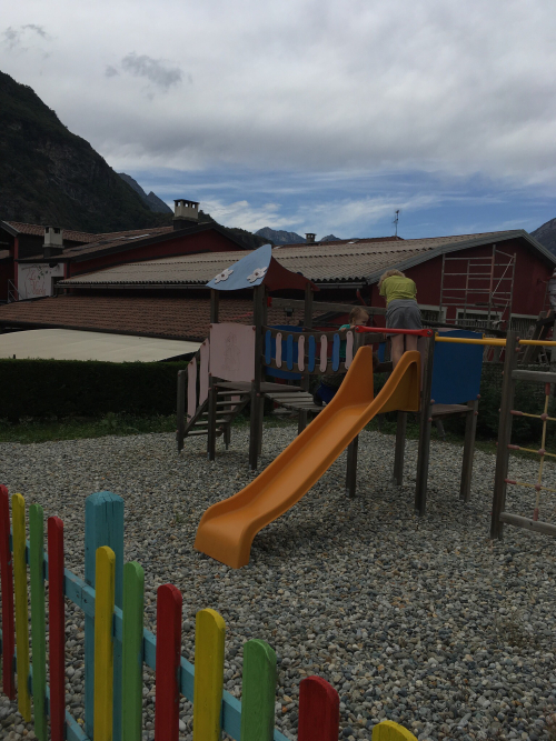 Anyway, besides a simple rotini with tomato sauce for the two littlest boys, the pasta choices were puttanesca (heavy on the olives, light on hot pepper) and the same tortellini with ham and nutmeg-scented cream sauce that we have seen all over Aosta. We got pasta for everyone, and then we only ordered one each of the two secunda. These were roast beef or fish steak (I don’t know what sort of fish it was; it was mild and white and tasted good), served with herbed well-cooked peas, really delicious diced browned potatoes, and a weird little omelette rolled up with a soft cheese inside.