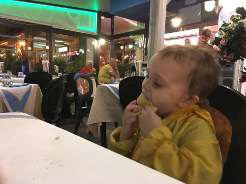 The 3yo methodically destroyed the breadsticks and did not even stop to decide whether they had been die-extruded onto a belt or not. Then, when those were gone, he started in on the basket of baked bread rolls.
