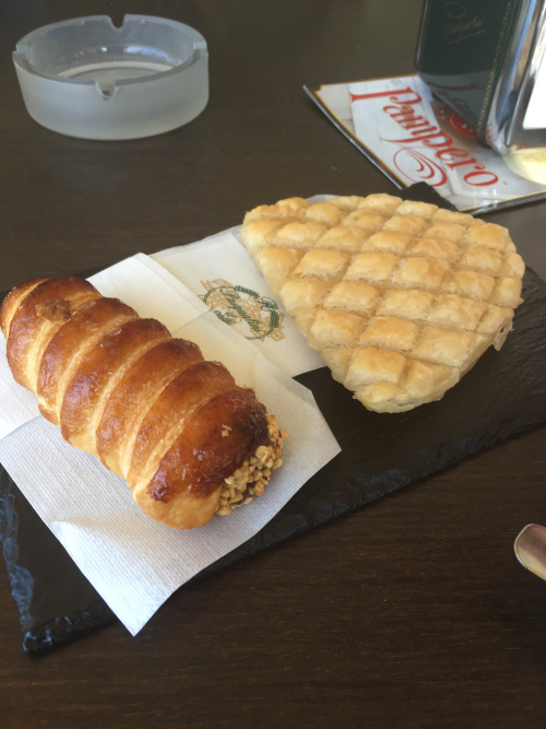 Mark got a hazelnut pastry cornucopia thing, and I got a quilted puff pastry full of “crema.” Which was a sort of eggy custard.