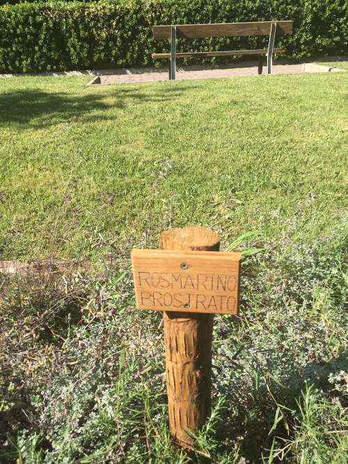 There is a little herb garden here. Lemon thyme, and oregano, and rosemary, all carved into little signs.