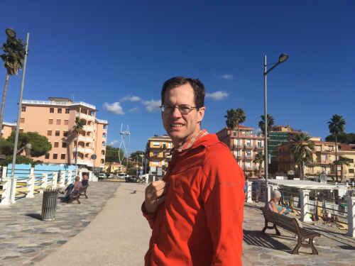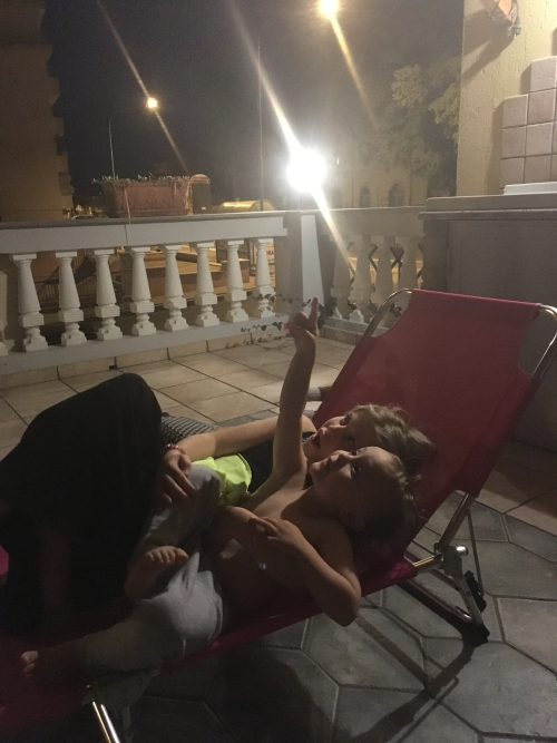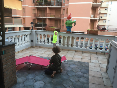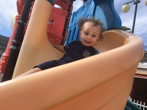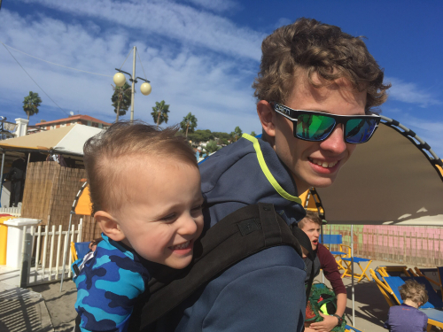 So I kept a firm grip on the 3yo’s hand, and Mark kept the 7yo, and we ordered the tween and teens to stay close in. And the lifeguard watched us nervously, as we were literally the only family on the whole beach. And at three o’clock the lifeguard got my attention and said: Il parco de gioca è aperto adesso. And I said “Thank you! Grazie!” and asked the two little boys if they wanted to go to the playground, and they shrieked yes and ran over the sand, with me chasing after them warning them not to step on the jellyfish.