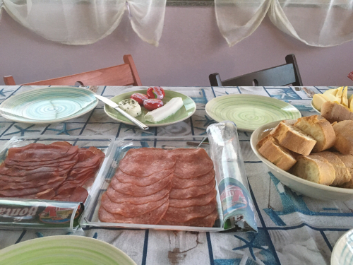 We bought breadsticks, and cheese from the deli (sold by the weight, so you have to talk to someone to get it). Cereal. Crackers. We moved on to a pastry shop and bought loaves of fresh bread, and six cookies for the children, and two stuffed cannoli. We stopped at a final small grocery and bought wine, and apples. The store owner’s two little daughters brought me a basket to put the apples in as I selected them.