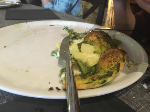 Except the 13yo, who had ordered the pizza Genova: pesto, with roasted potatoes and slim green beans. The crust was perfect, crisp and light. We traded some. It was heavenly.