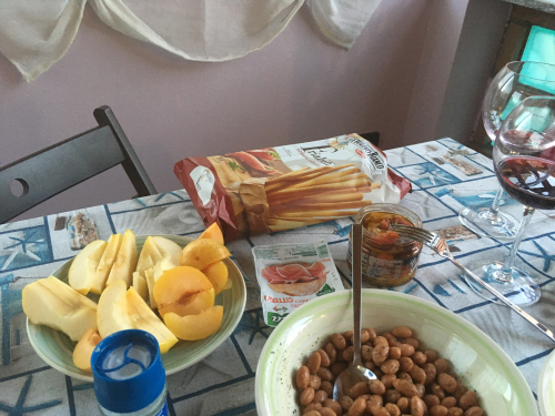 “What?!” He bent over the machine to tinker with it, and I microwaved my espresso. Then I started pulling things out of the fridge. Cold meats, and the cheese from the deli —both goat cheeses, it turned out—wine, and a can of borlotti beans that I doused with oil and vinegar, salt and pepper; and a jar of roasted peppers, and a bag of hard breadsticks, and a plate of cut apples and yellow plums. We set it all out on the patio and fell to.