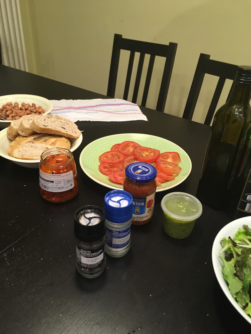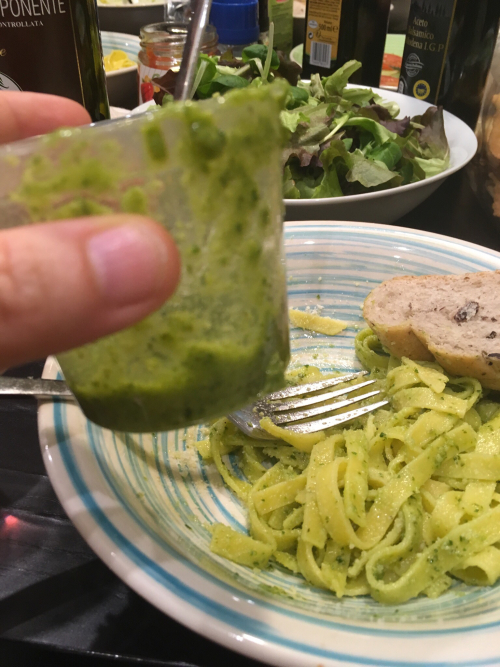 We drove the hour back to Andora, stopped in a grocery store for bread and olives and jarred peppers and beans, and made a feast out of refrigerated pasta boiled three minutes with Genovese pesto from the deli, and bread and meat and fruit.