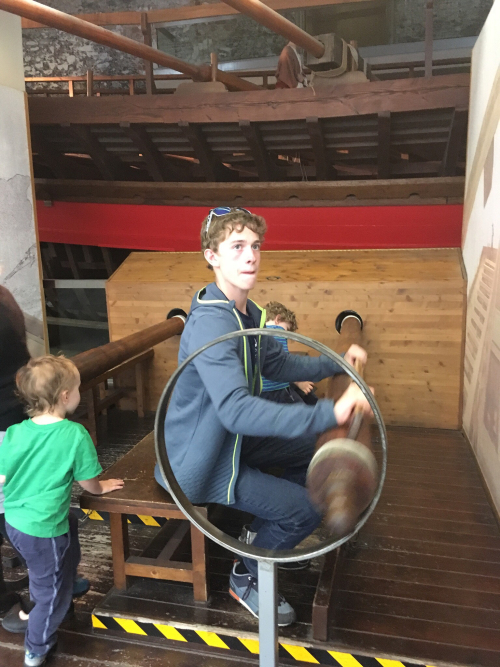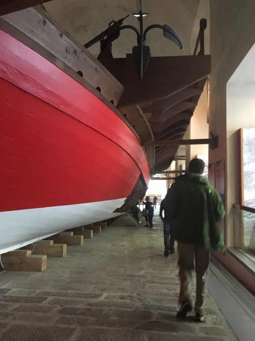 There was also a temporary exhibit about the Andrea Doria and its sinking, including a reconstructed room listed to 30°. And some atlases and globes were exhibited under glass, some hundreds of years old. One was an edition of Mercator’s atlas. There were also navigational instruments, clocks, and a simulated galley bench with an oar-handle to try to row.