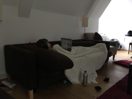 It couldn’t last long, because people had to go to the bathroom. Fortunately our apartment is only a block away. We went there, and turned on the TV, and rested a while.