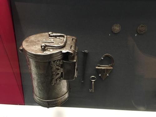 There were items for storing money, such as this 18th-century poor-box, which had a double lock so that it required at least two different keys to open it.